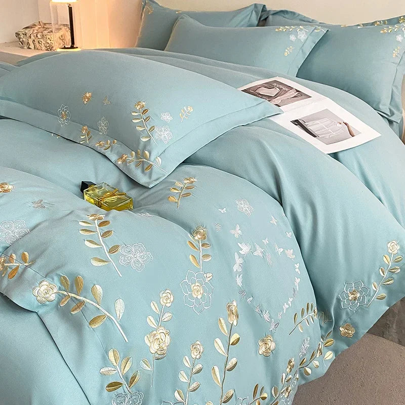 4pcs/set Light Luxury 120s Pure Cotton Floral Embroidered Quilt Cover Pillowcases Fitted Sheet Skin-friendly Naked Bedding Set