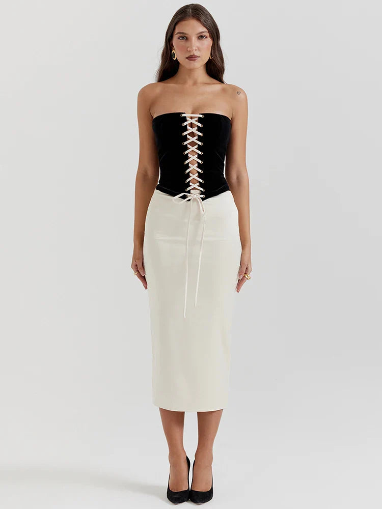 Black Lace Up Tube Top And White Satin Midi Skirt Set