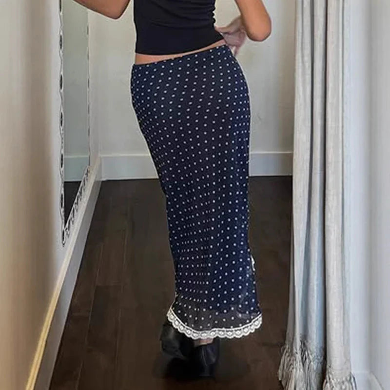 Blue Polka Dot Lace Trim Midi Skirt