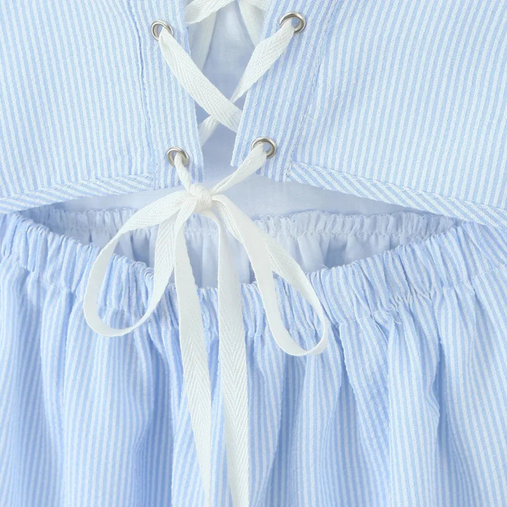 Blue Stripe Lace Trim Babydoll Mini Dress