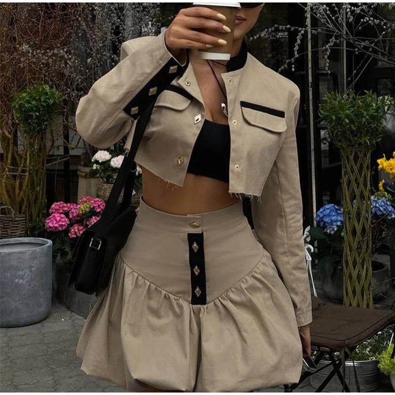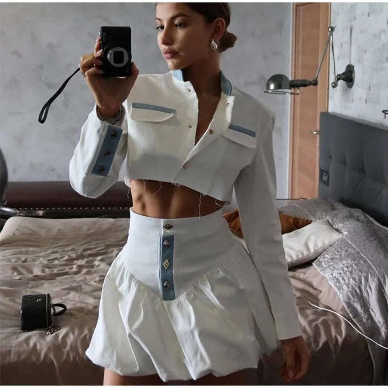 Crop Jacket And Puff Buttoned Mink Skirt Contrast Set