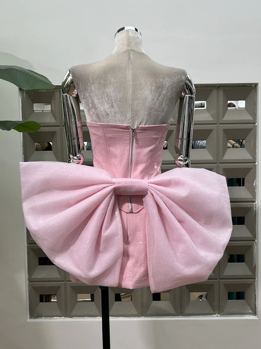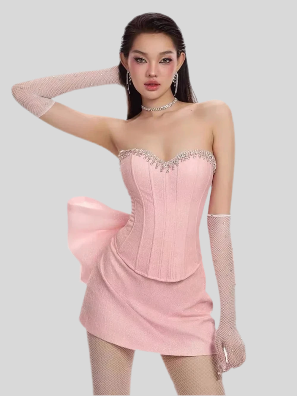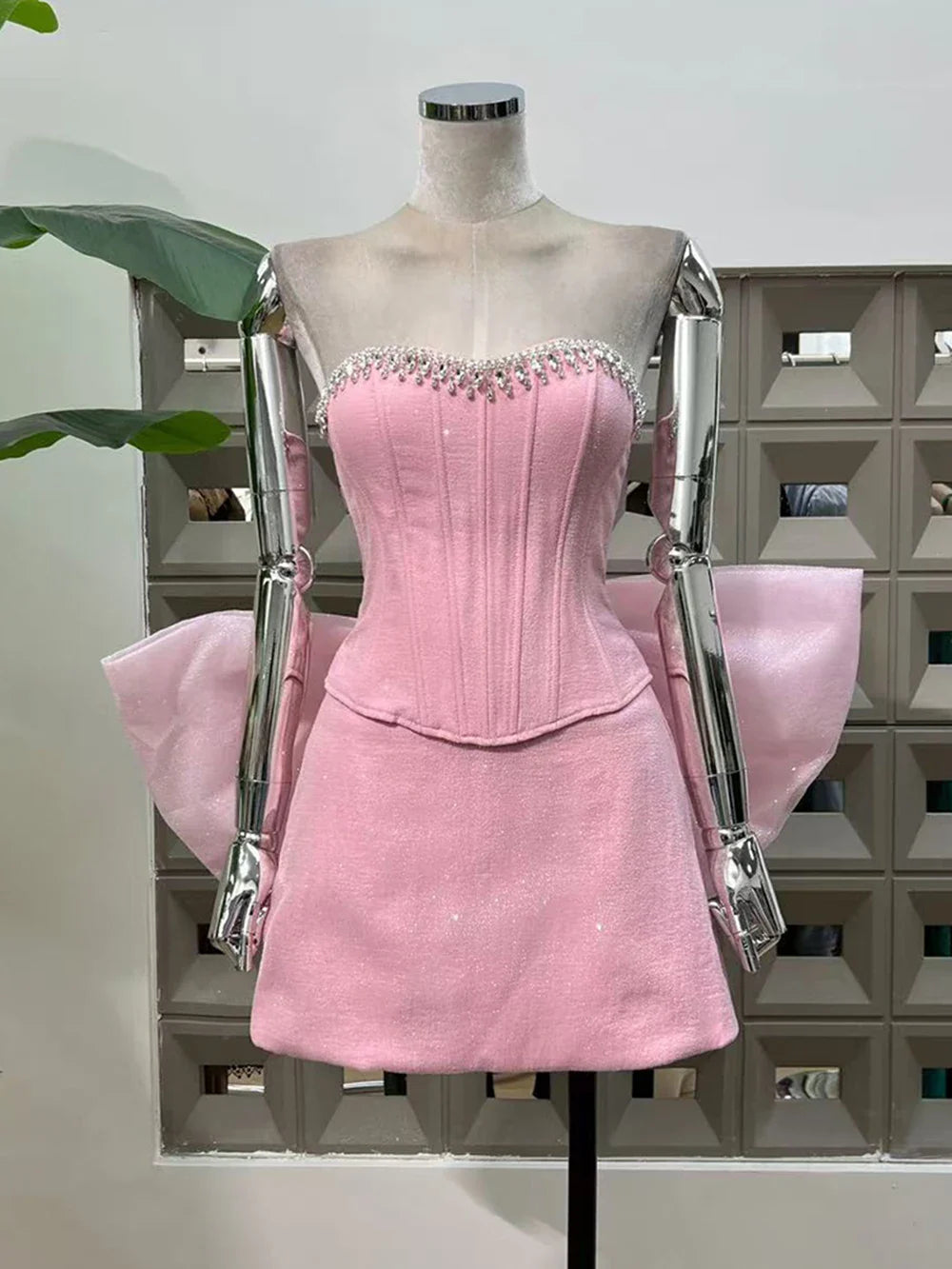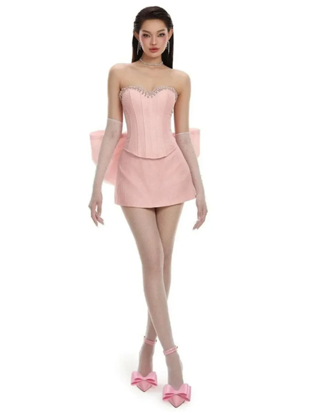 Diamond Strapless Large Bow Corset Top And Mini Skirt Set