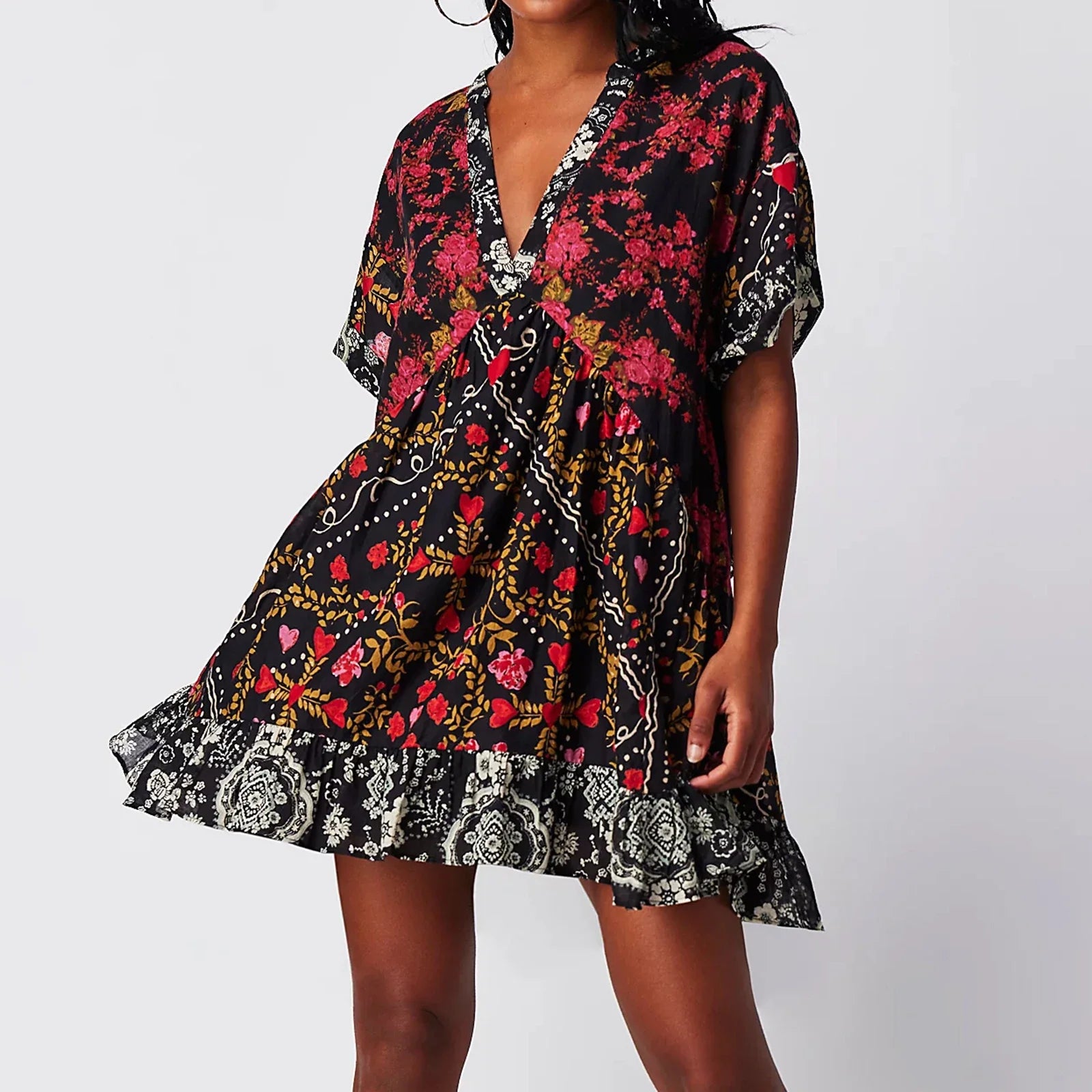 Floral Print Short Sleeve V-Neck Ruffled Hem Loose Mini Dress with Pockets