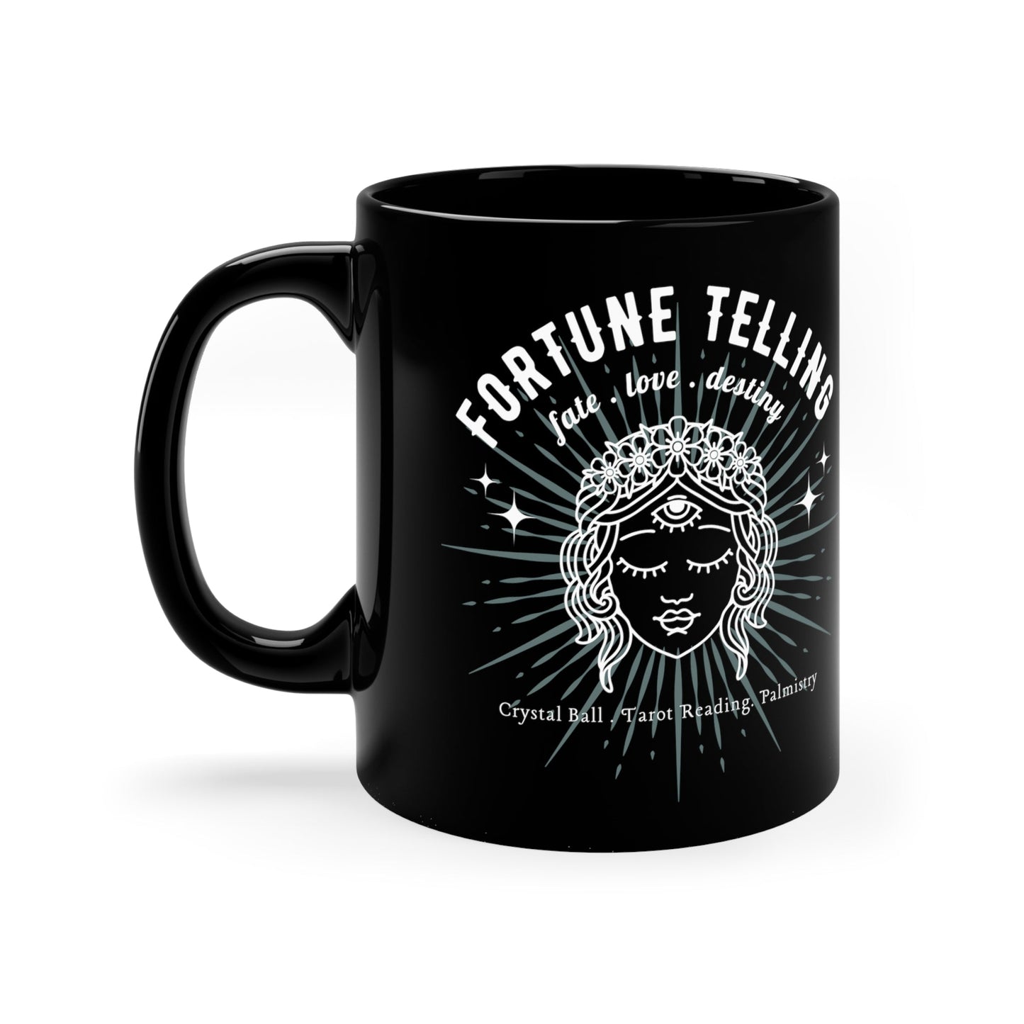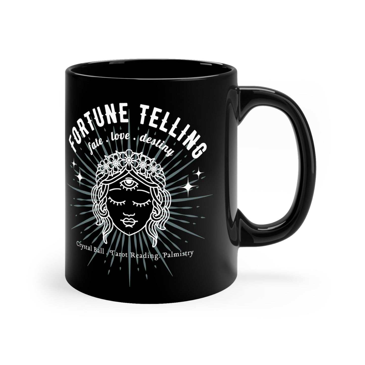 Fortune Telling 11oz Black Mug, Mystical Coffee Mug, Psychic Graphic Design, Crystals, Tarot, Palmistry
