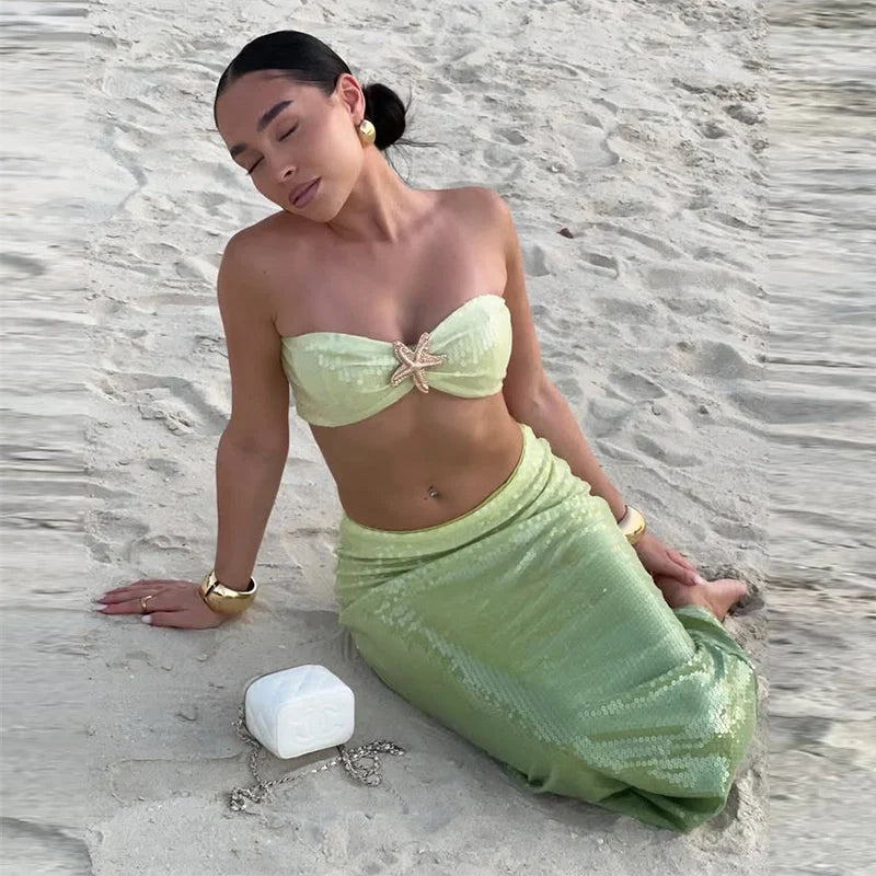 Green Ombré Starfish Sequin Bralette And Maxi Skirt Set