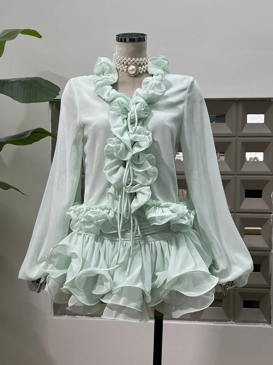 Green Ruffles Tie Up Mesh Top And Skirt Set