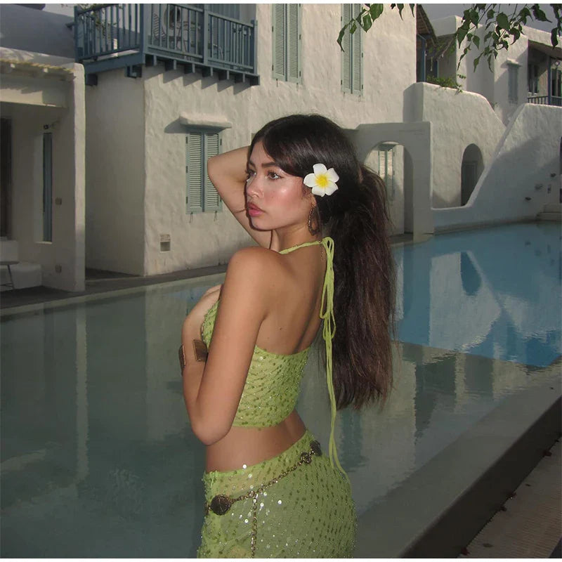 Green Sequin V-neck Halter Tie And Midi Skirt Set