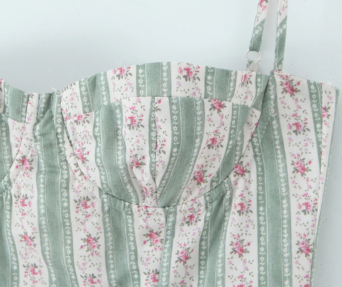 Green Striped Floral Print Corset Style Midi Dress - Sweet Fit & Flare