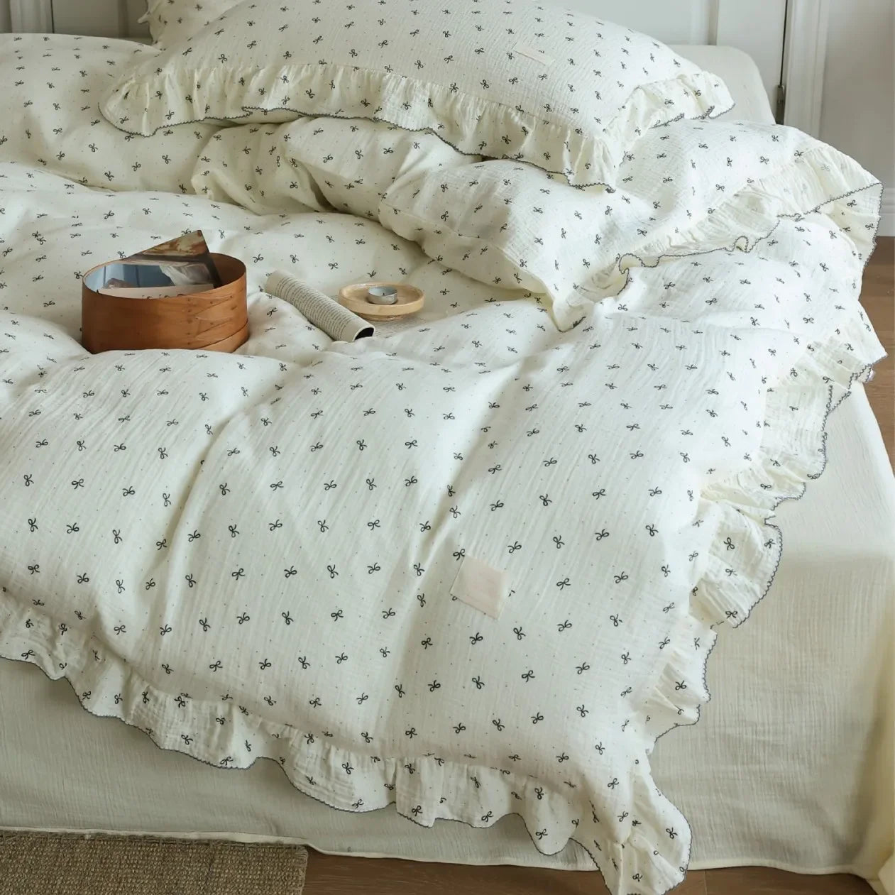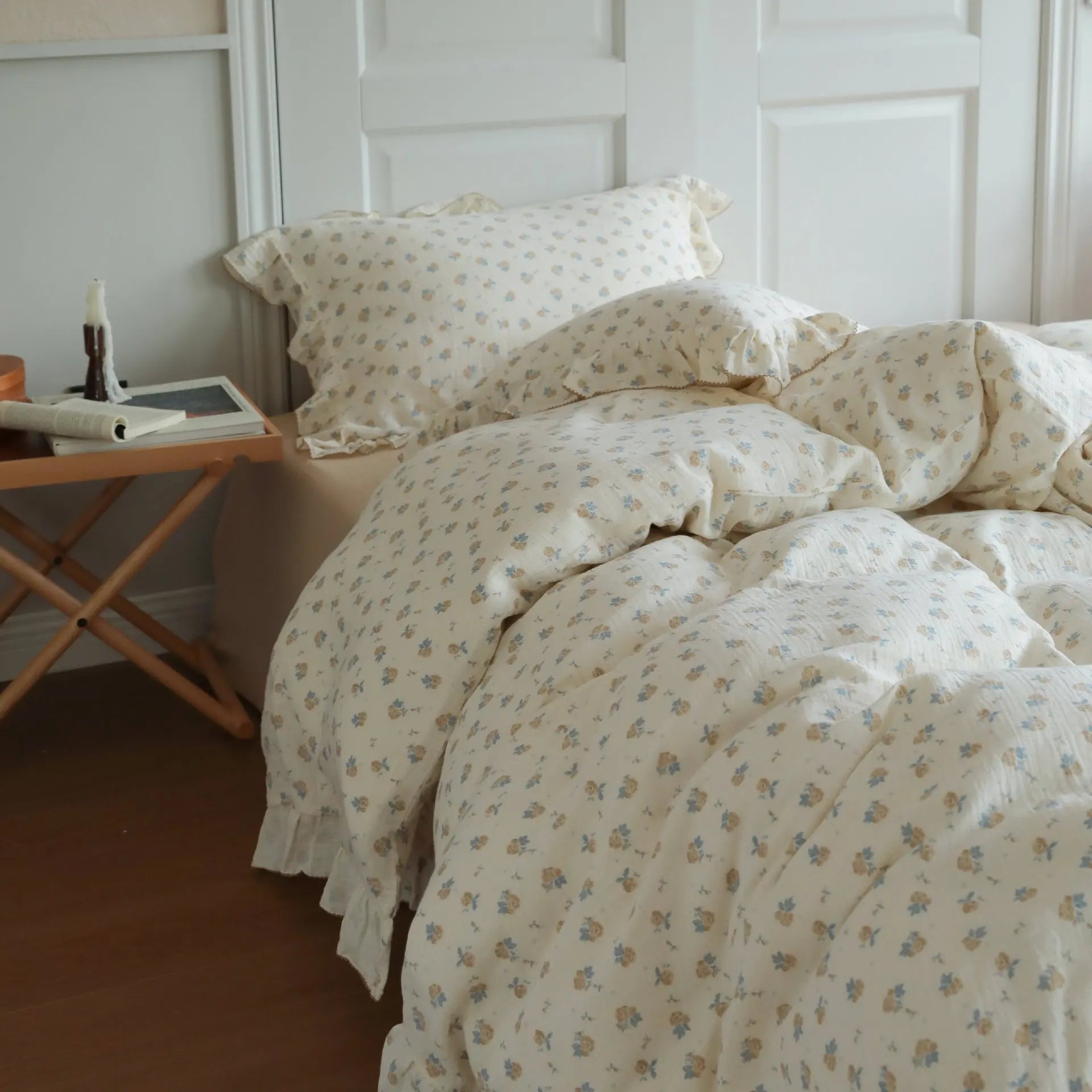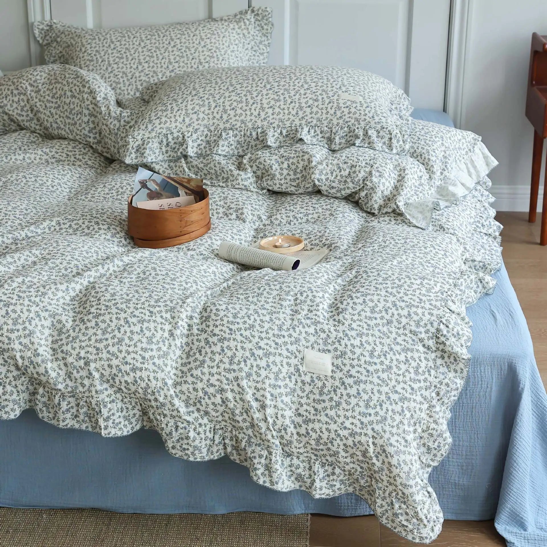 INS Princess Ruffle Edge Gauze 100% Cotton Pillow Case Breathable Duvet Cover Without Filler 3PCS Floral Home Bedding Set