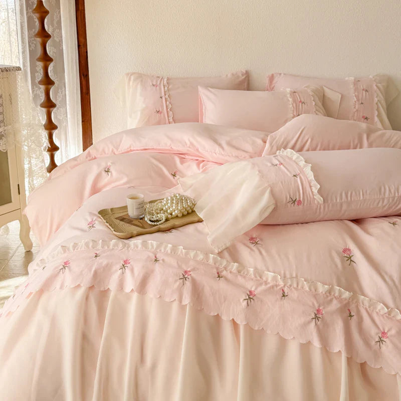 Korean Princess Style Lace Ruffles Rose Embroidery Wedding Bedding Set Duvet Cover Set Flat/Fitted Bed Sheet Pillowcases 4Pcs