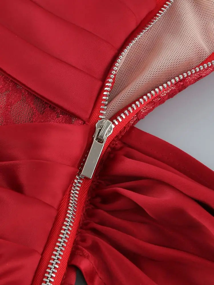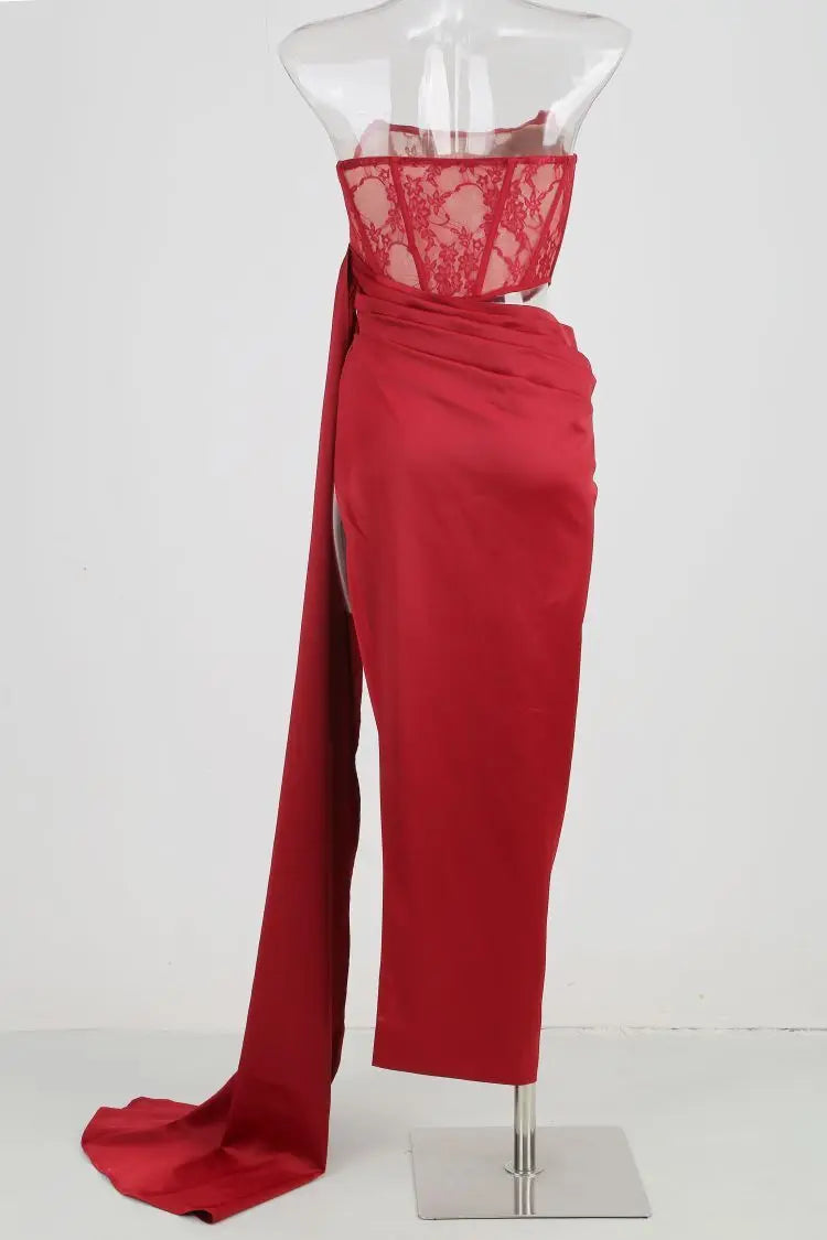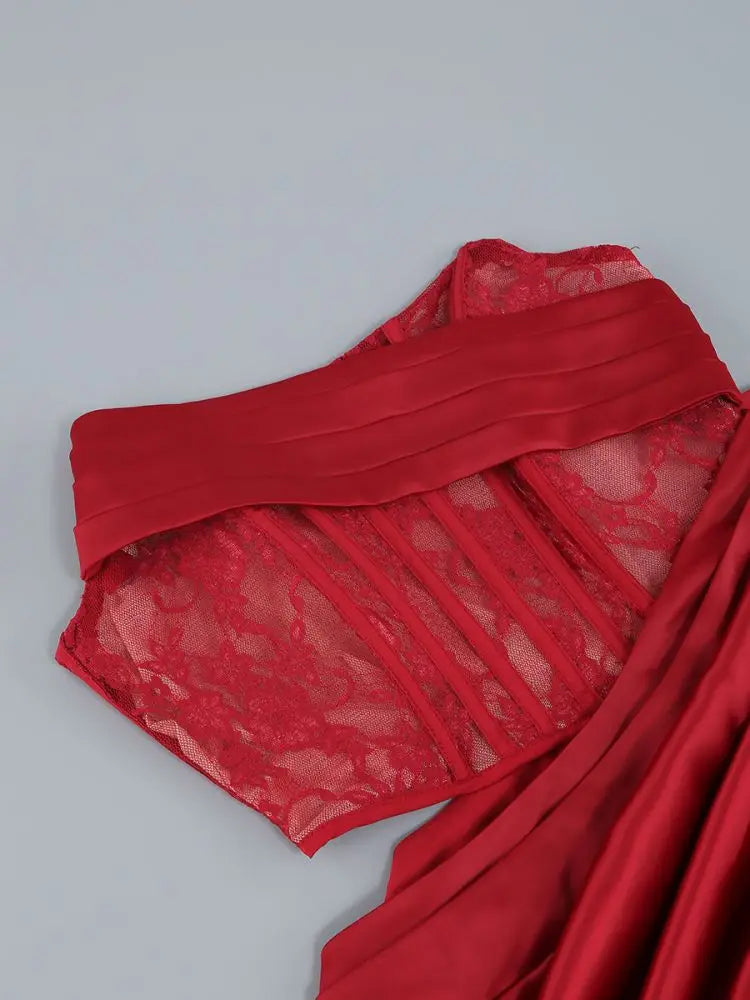 Lace Corset Cut Out Satin Draped Gloves Midi Dress