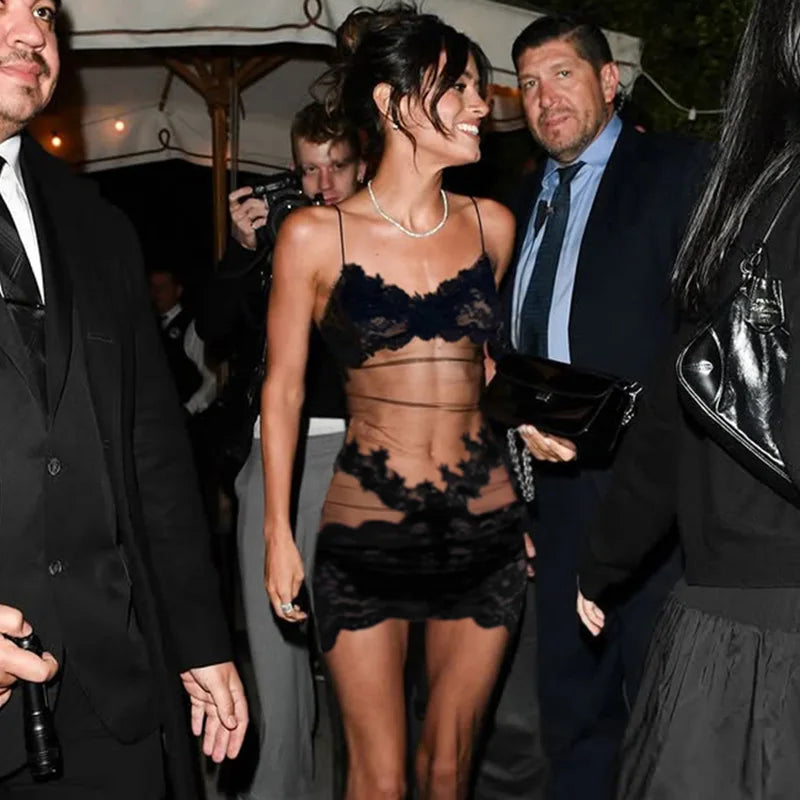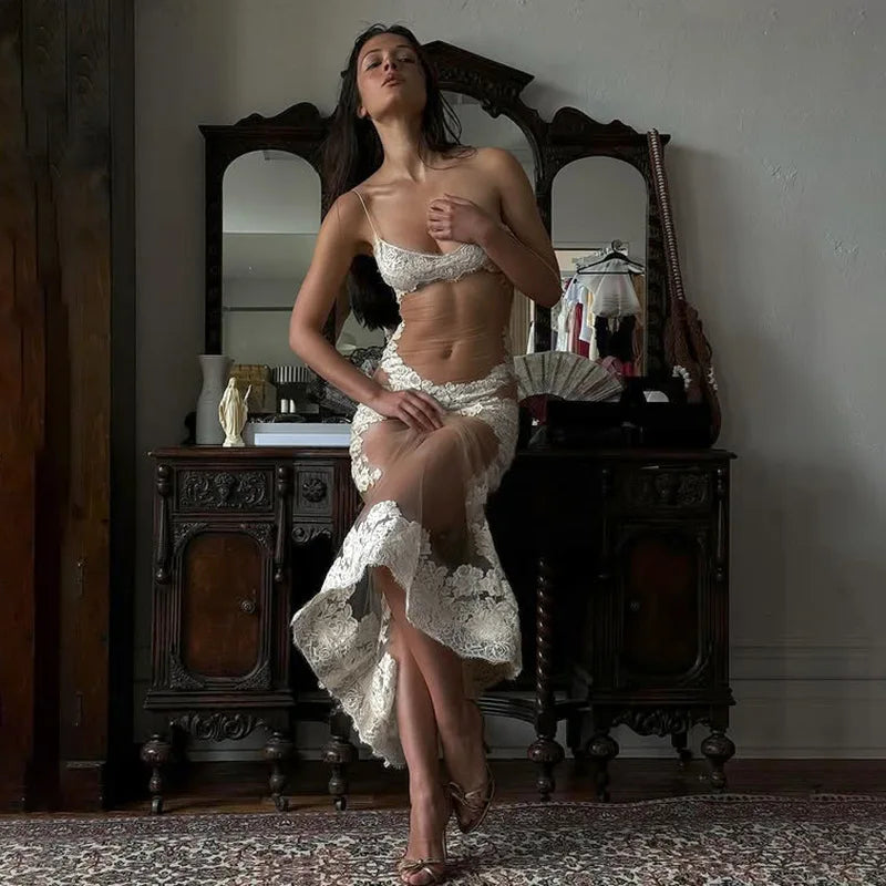 Mesh Lace Patchwork Spaghetti Strap Midi Dress