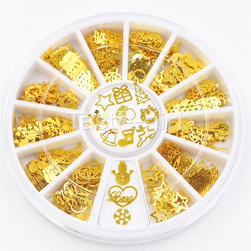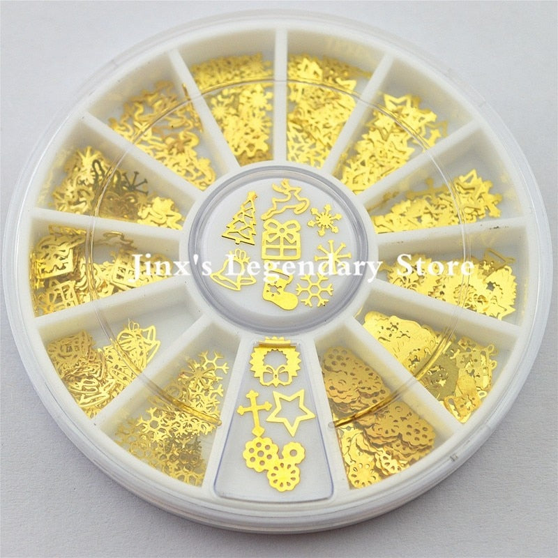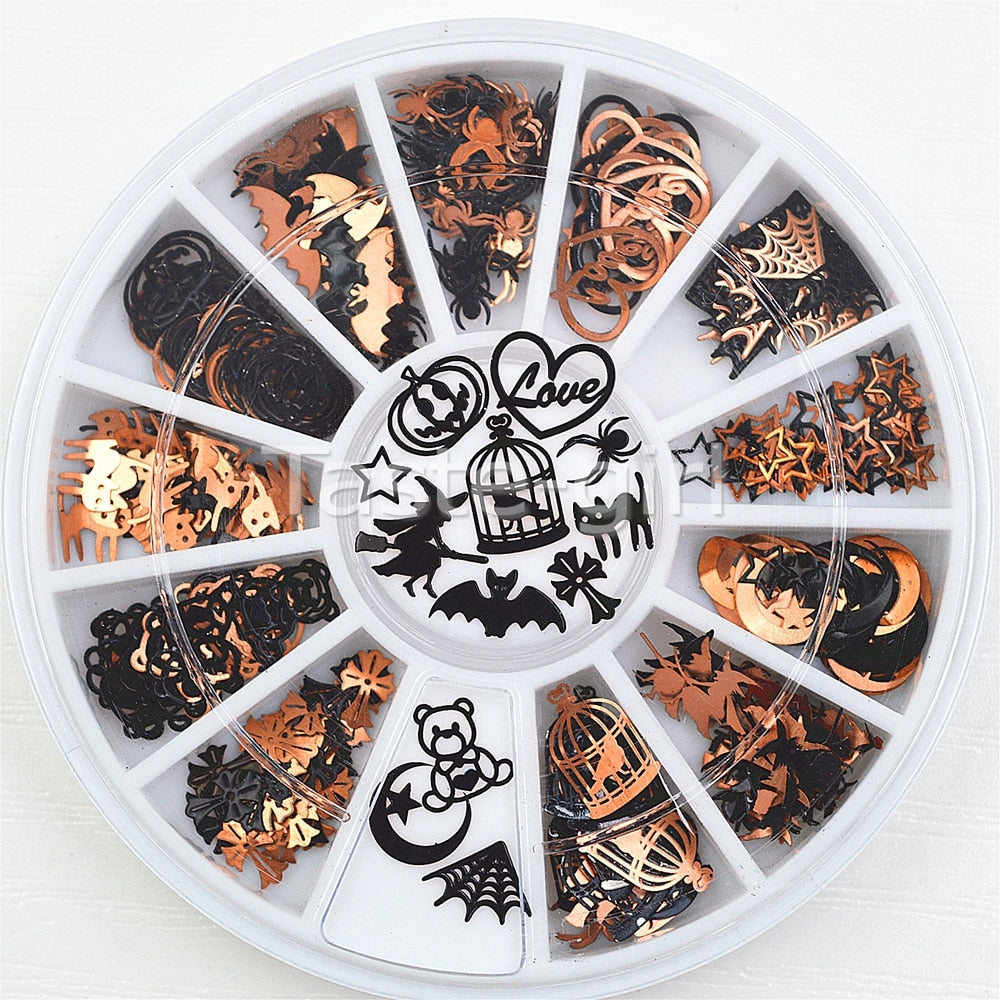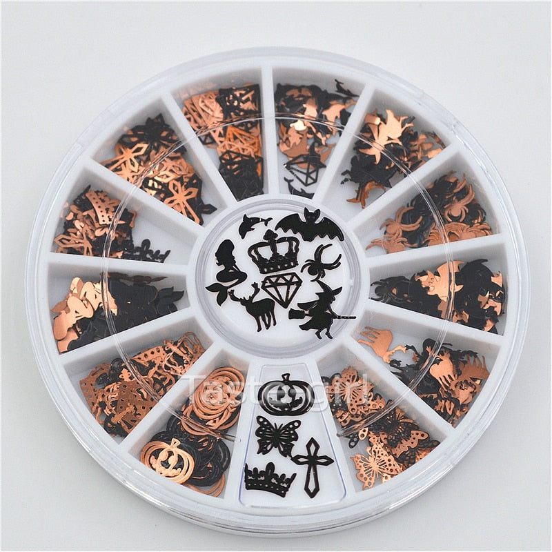 Mixed 12 shapes black gold metal Halloween christmas nail art decorations slice wheel nail foil decals fake nail accessoires