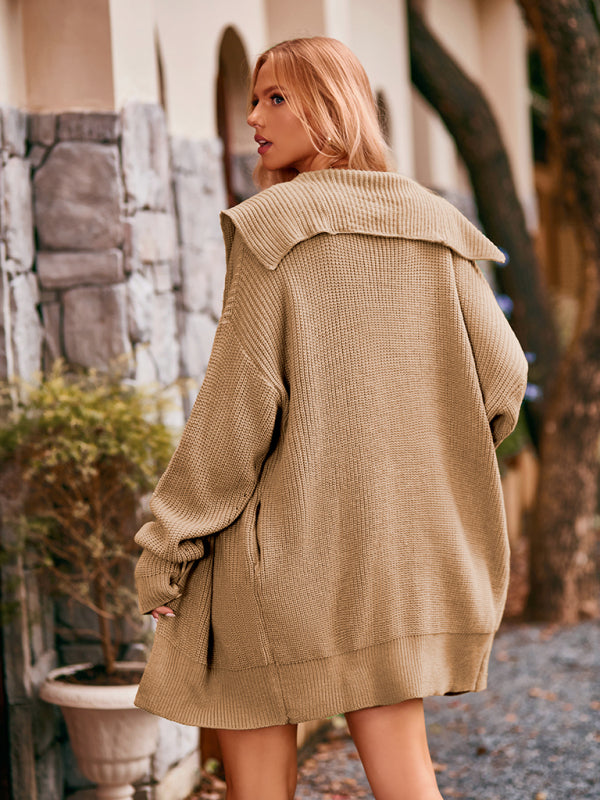 Solid Color Lapel Tie Pocket Cardigan Three Buttons Mid-length Sweater Coat