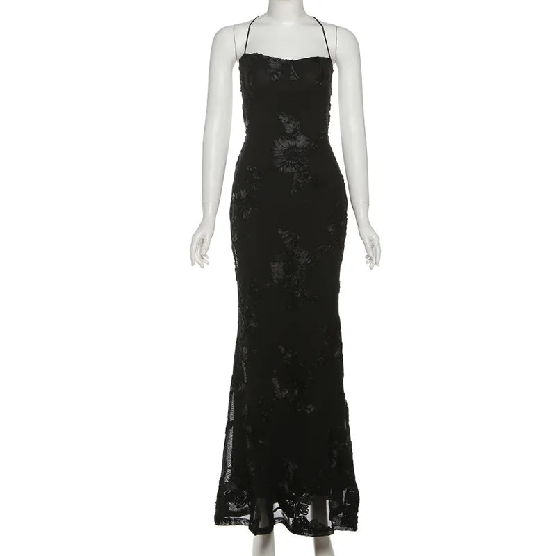 Open Back Lace Up Embroidred Flower Maxi Dress
