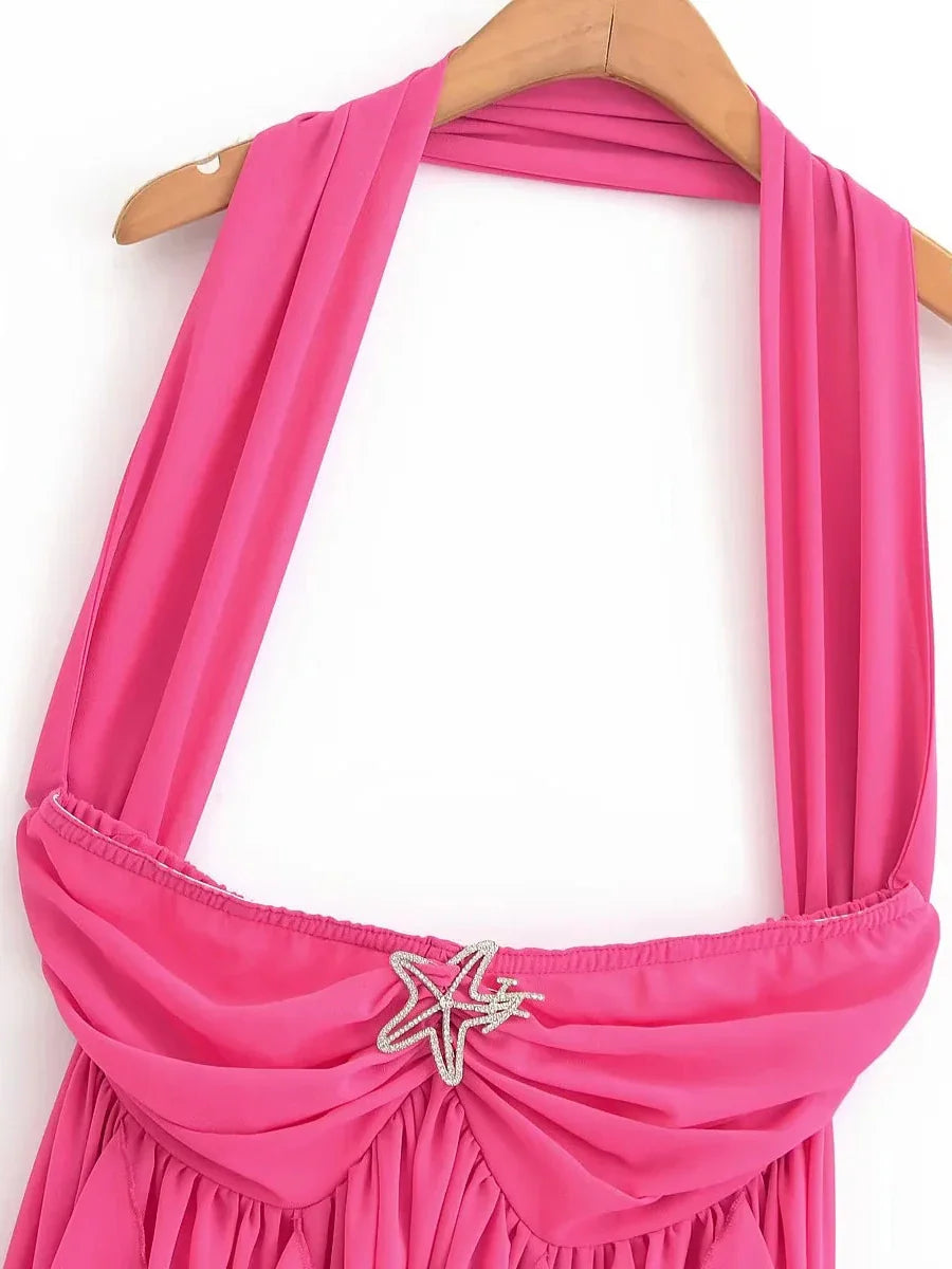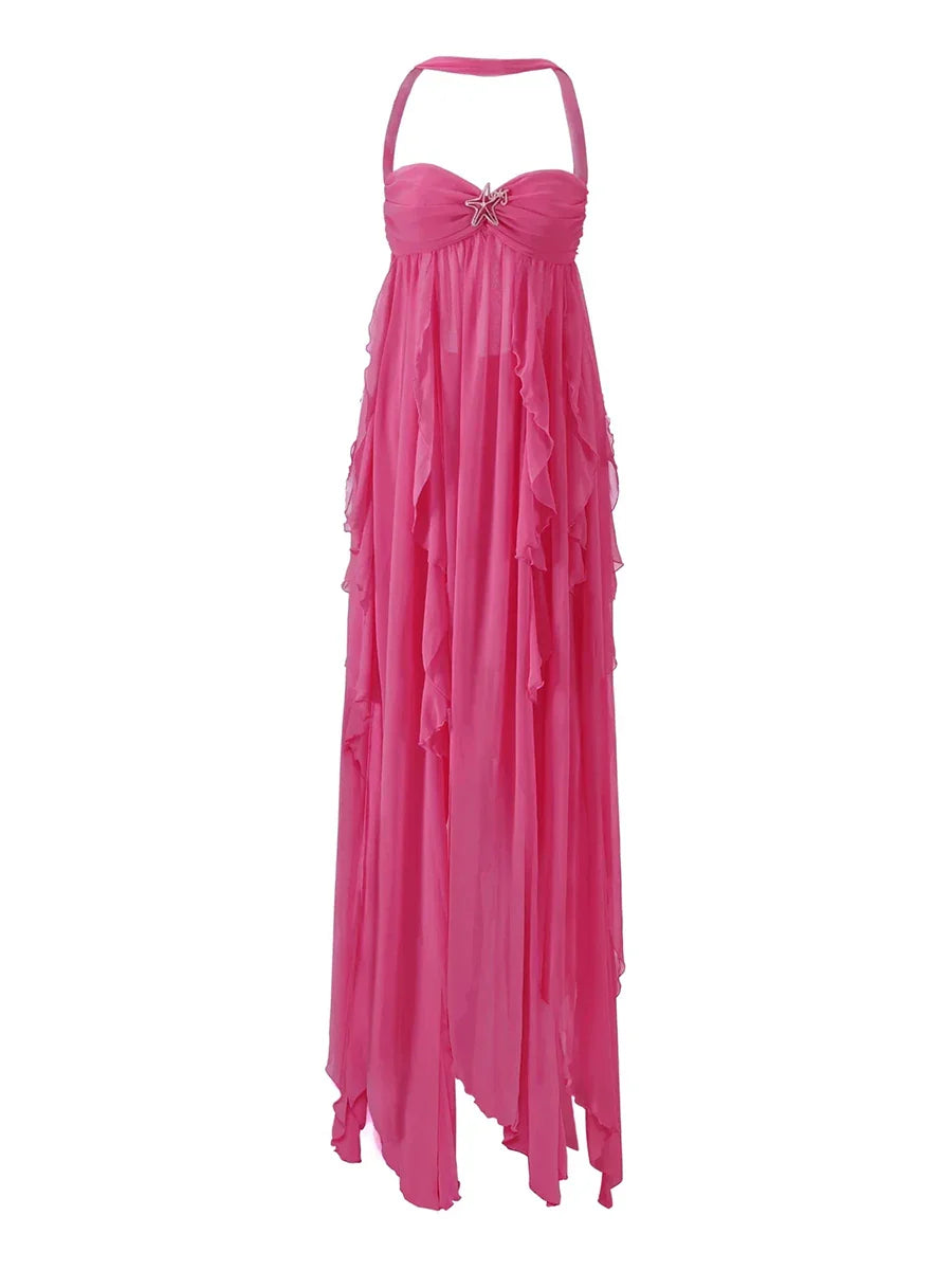 Pink Halter Ribbon Ruffles Frill Midi Dress