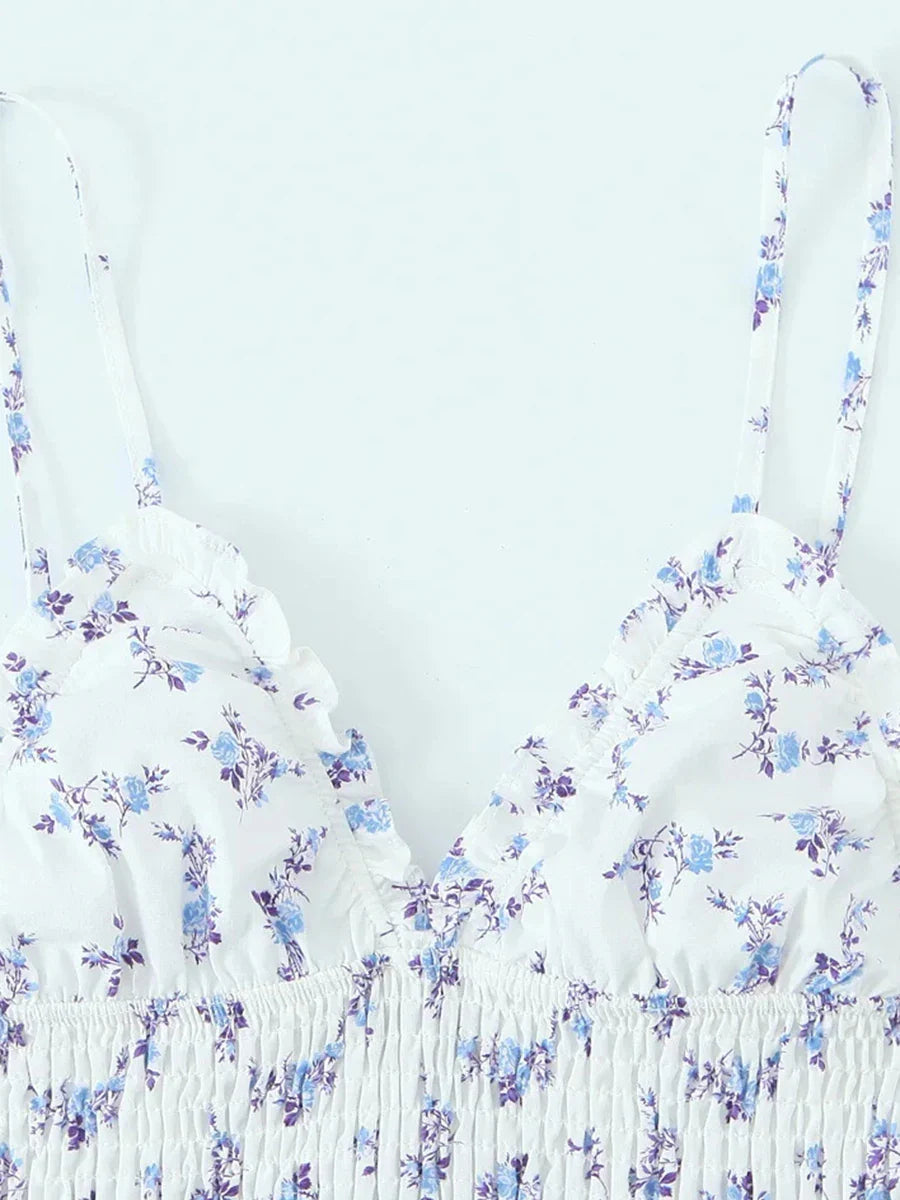 Printing Pleated V Neck Elastic Mini Dress