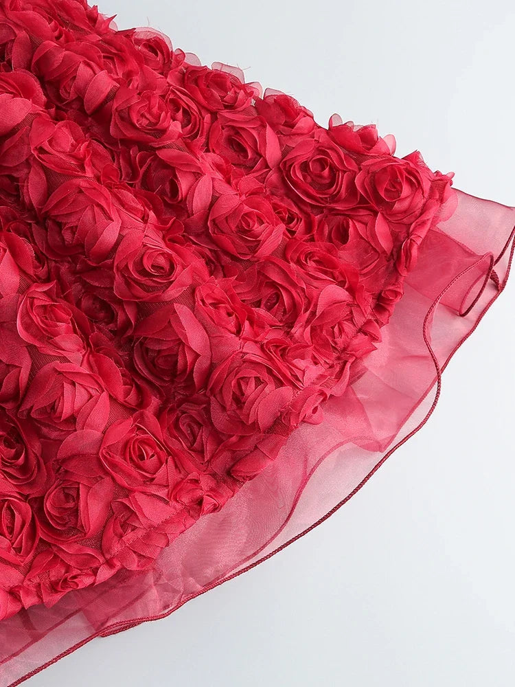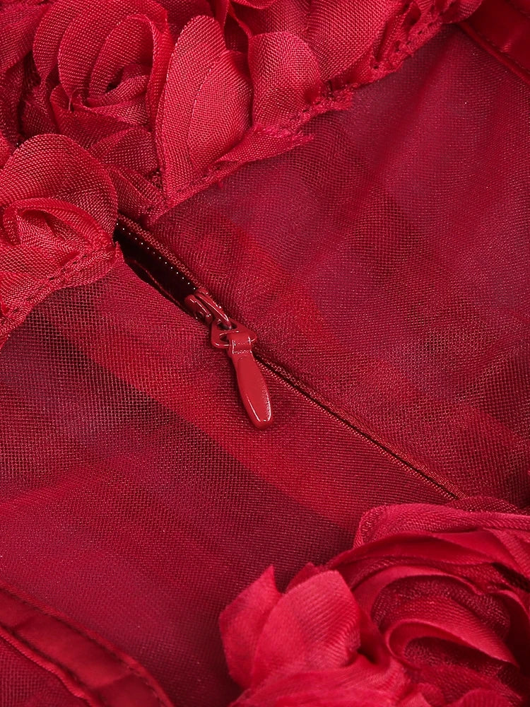 Red Mesh 3d Floral Frill Beaded Strapless Mini Dress