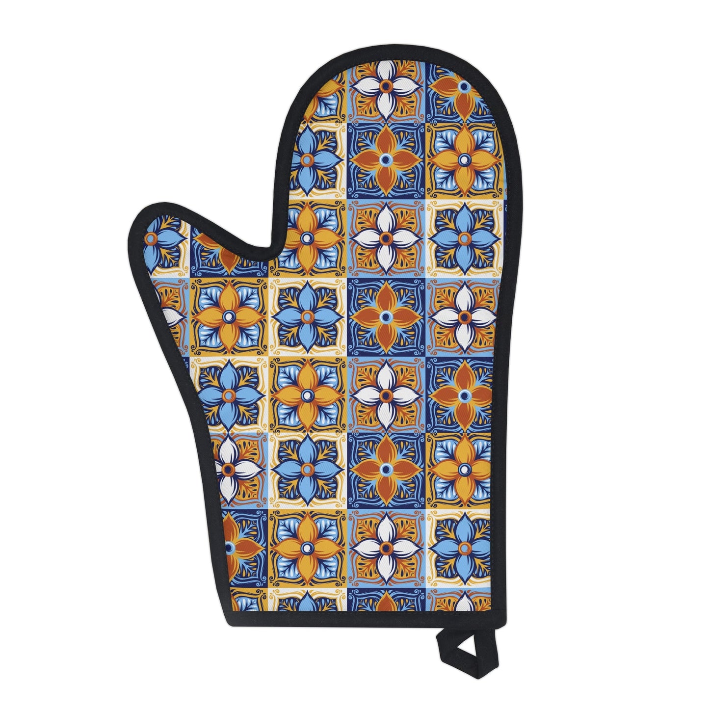 Retro Italian Tile Oven Glove, Mosaic Patchwork Blue and Yellow Oven Mit