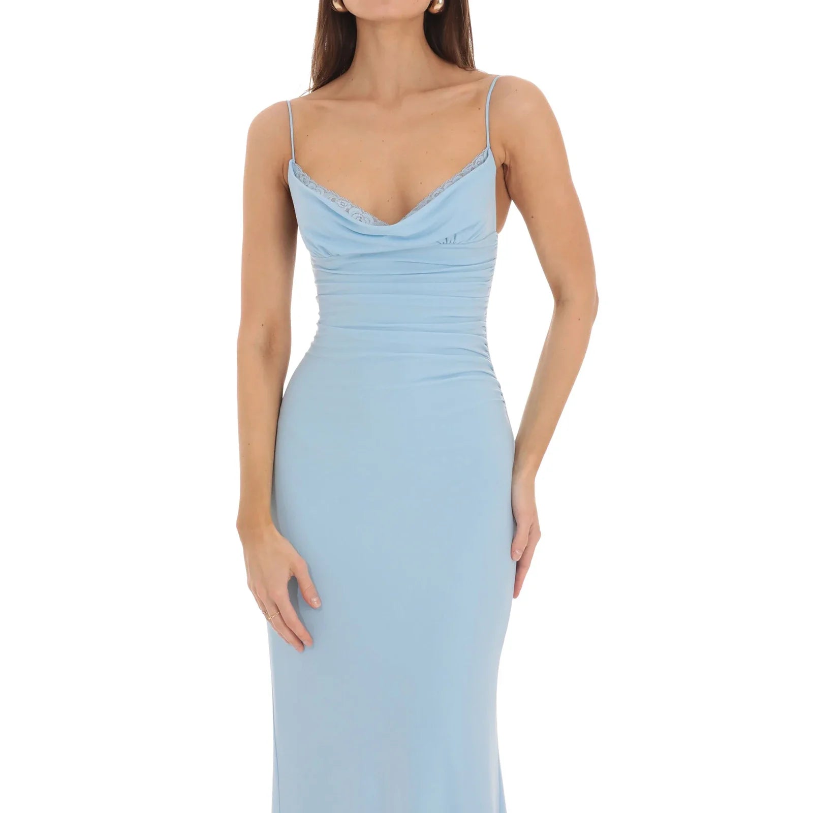 Solid Lace Trim Cowl Neck Maxi Dress