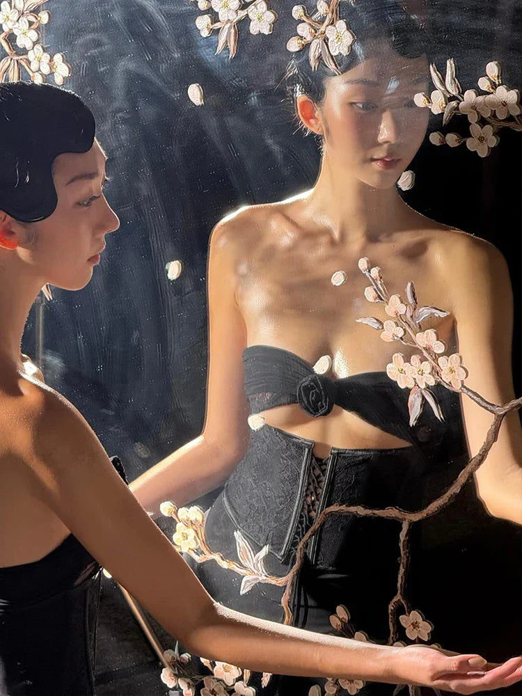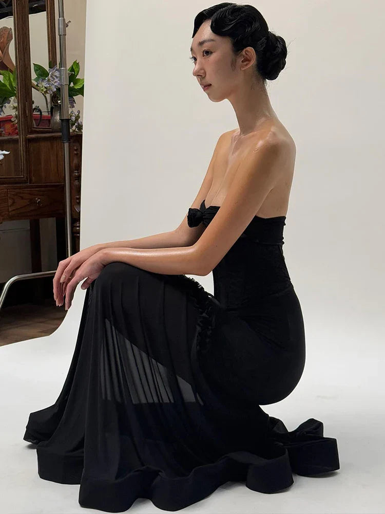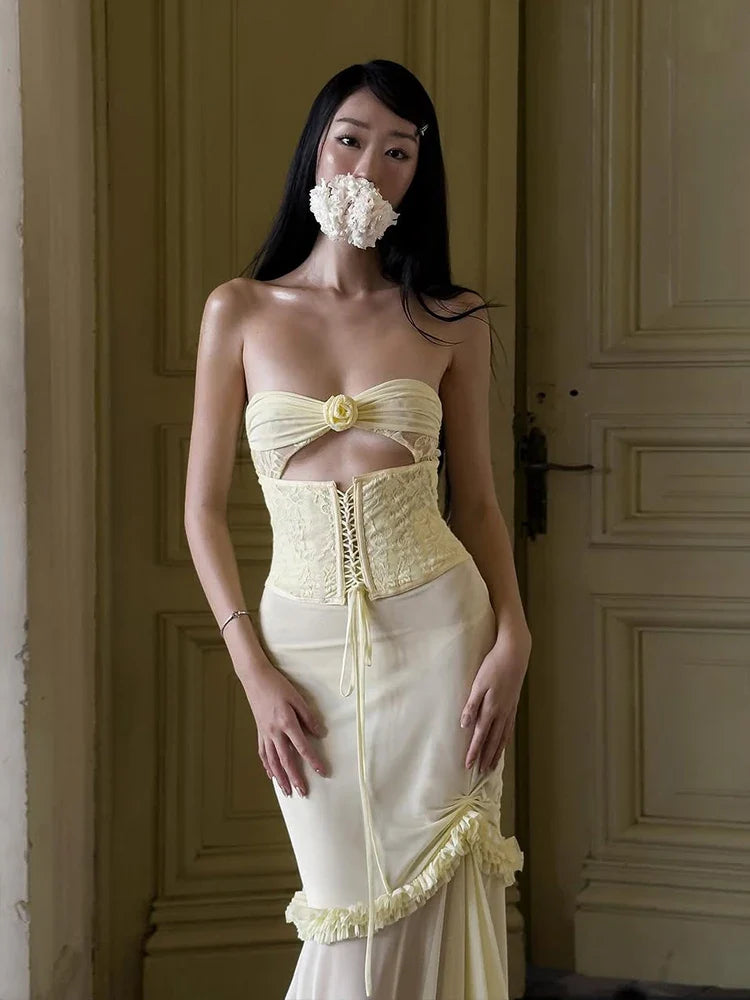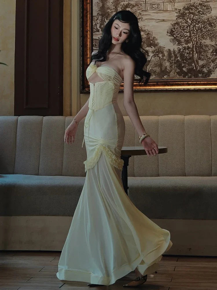 Strapless Cut Out Mesh Corset Ruffles Maxi Dress