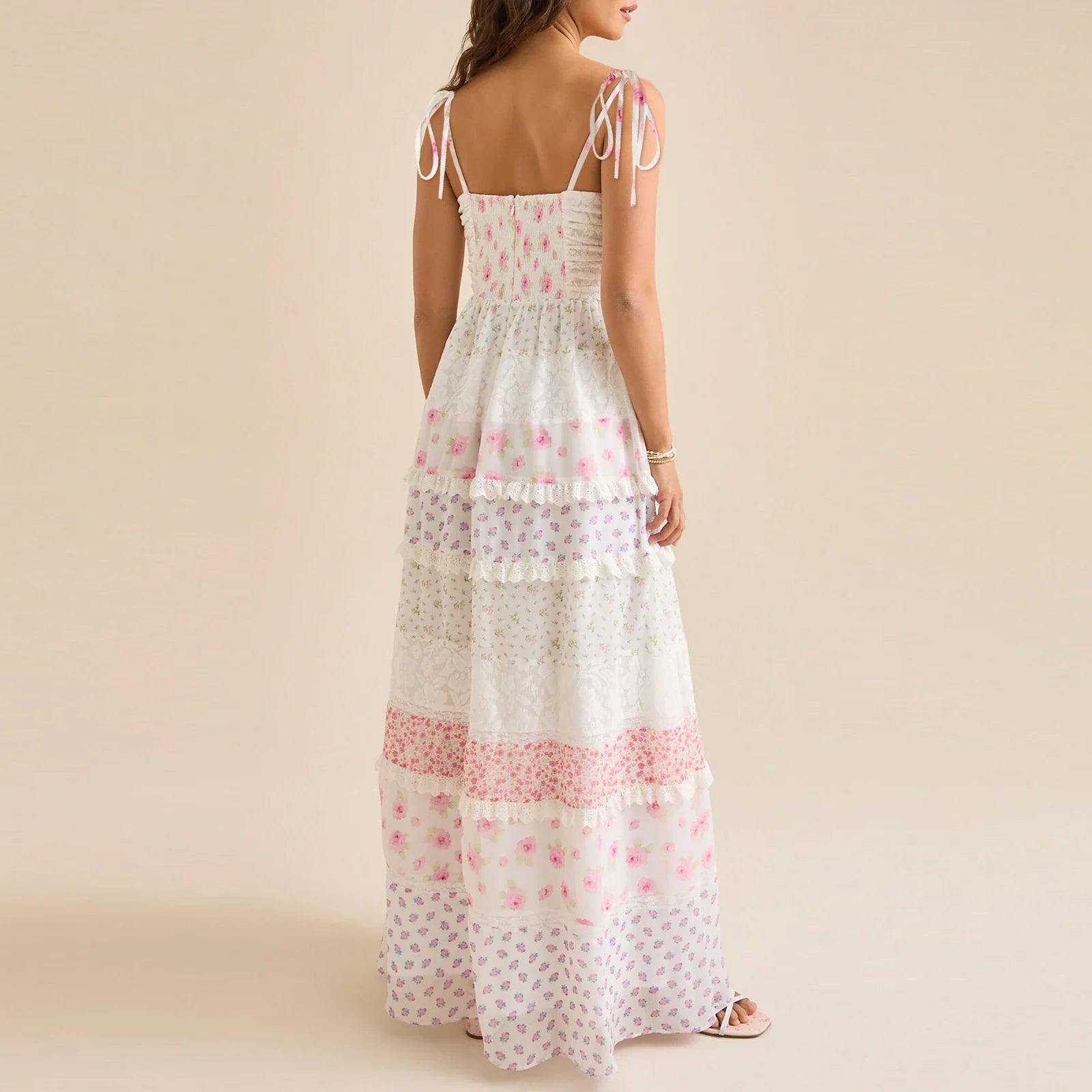 Whimsical Floral Patchwork Tiered Maxi Dress - Spaghetti Strap Summer Gown