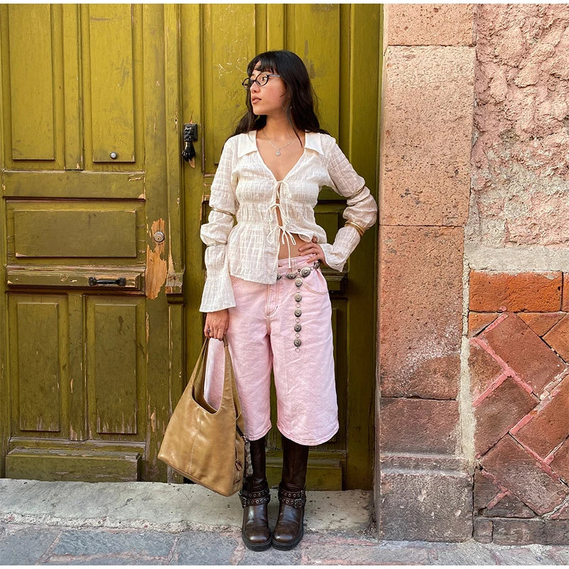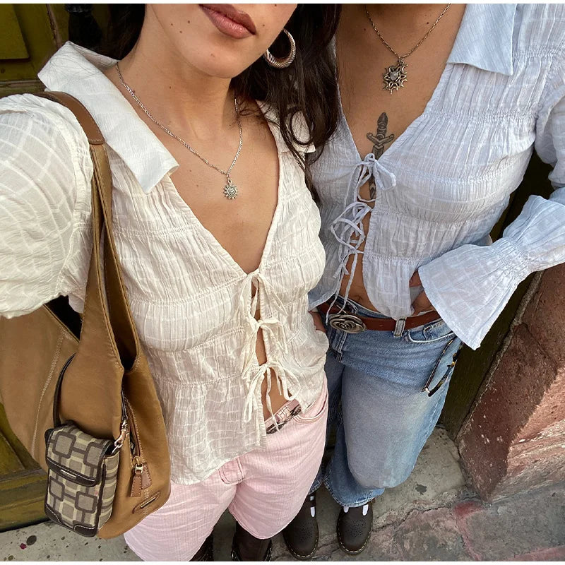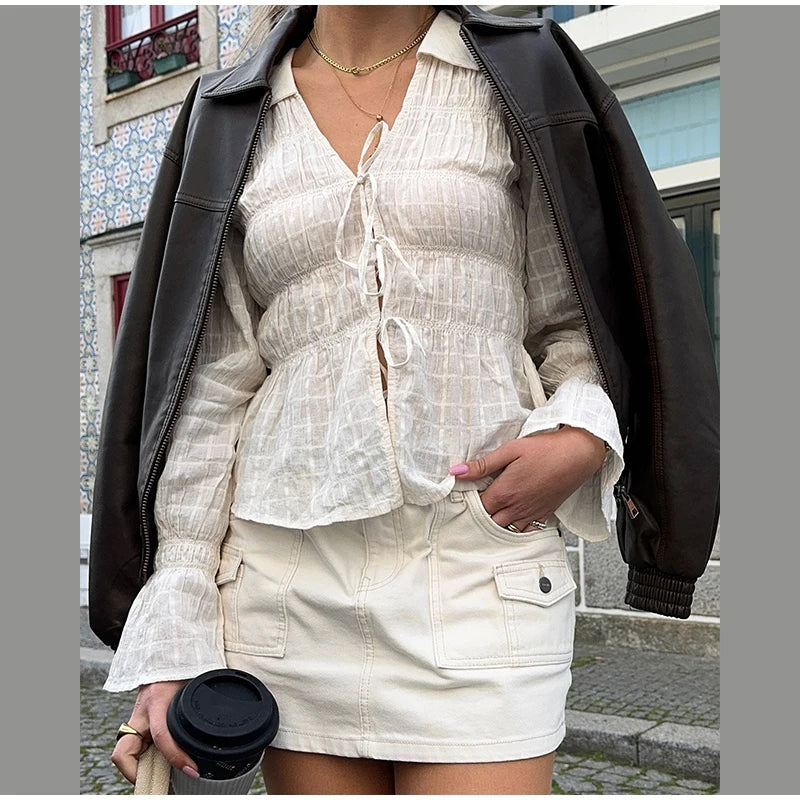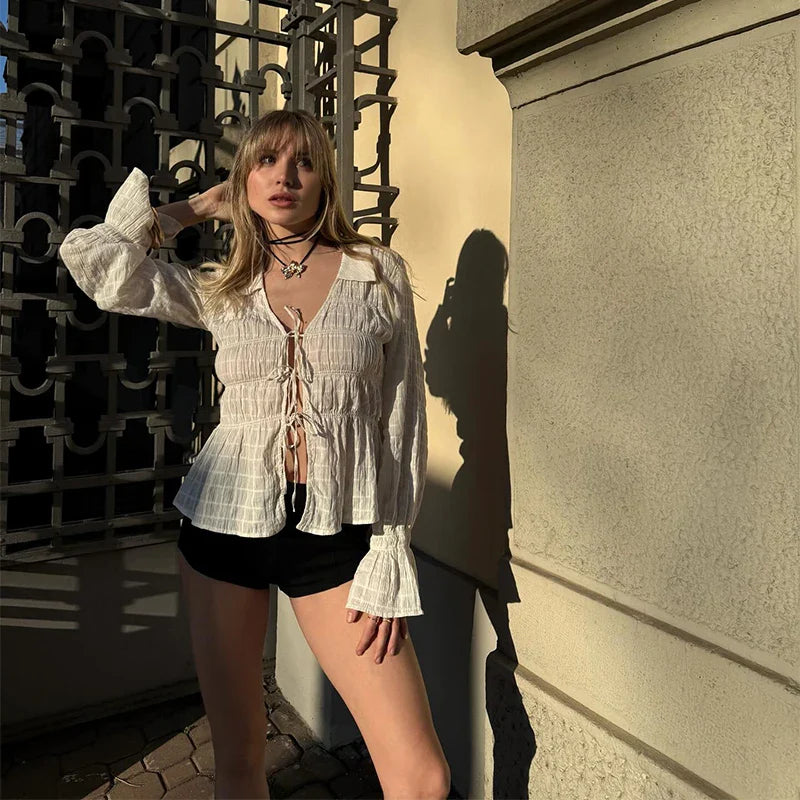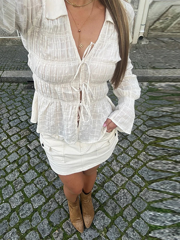 White Ruched Tie Up Long Sleeve Top