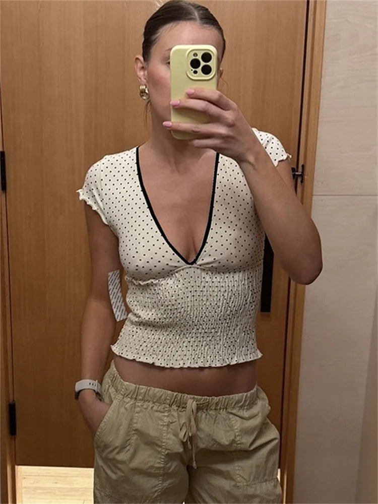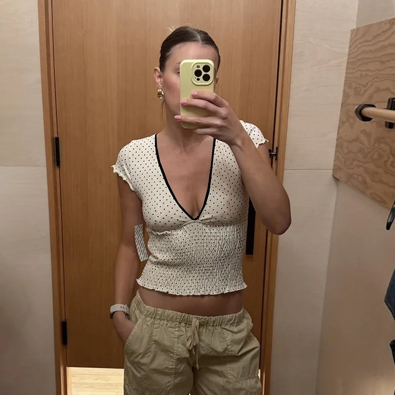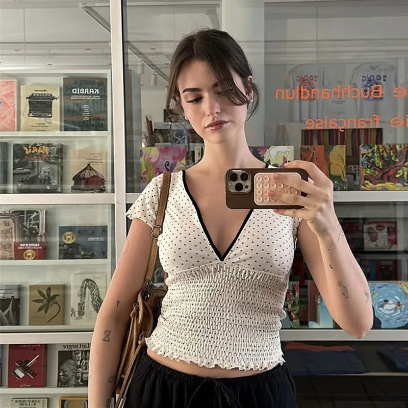 Step into effortless style with our White V-Neck Printed Short Sleeve Top. a comfortable and chic addition for any adult wardrobe. This eye-catching top features a vibrant print pattern that adds a dynamic touch to its crisp white background. The flattering V-neckline and comfortable short sleeves make it a versatile piece for warmer days. While "PATCHWORK" is listed as a decoration. the top maintains a cohesive printed look.