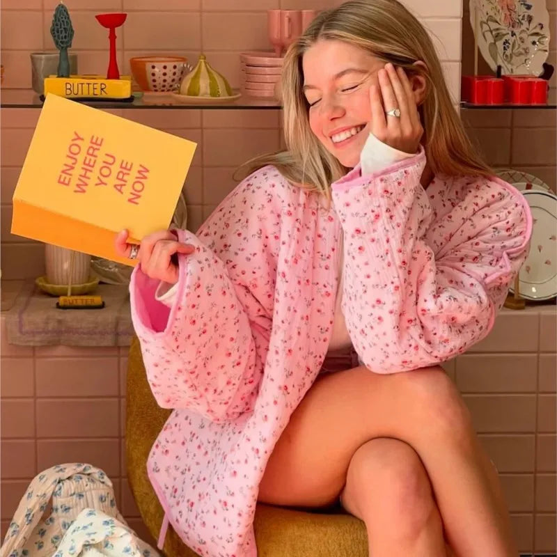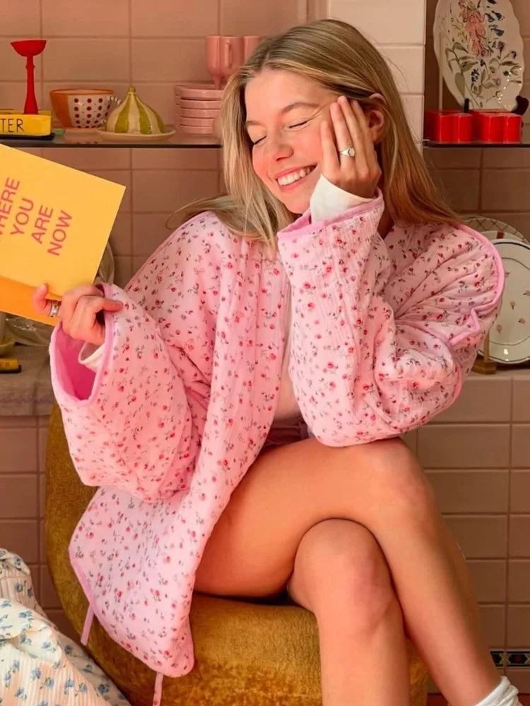 Women's Pink Printed Casual Knit Cardigan - Autumn/Winter Warm