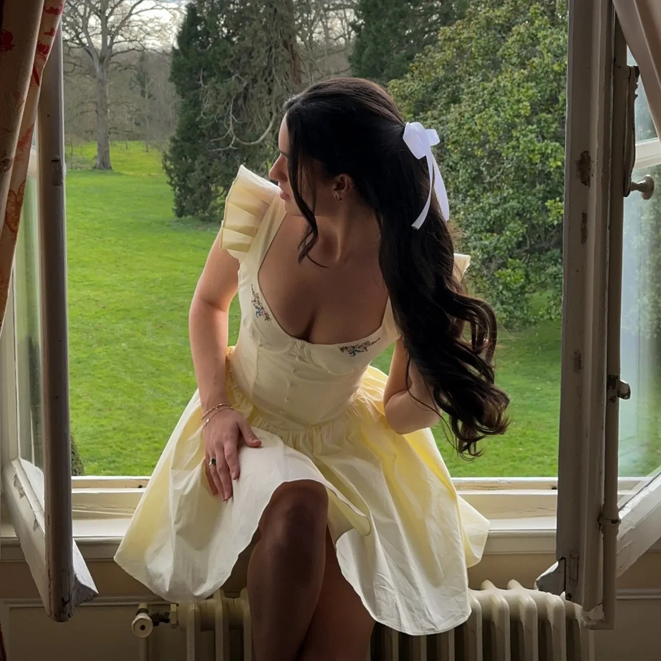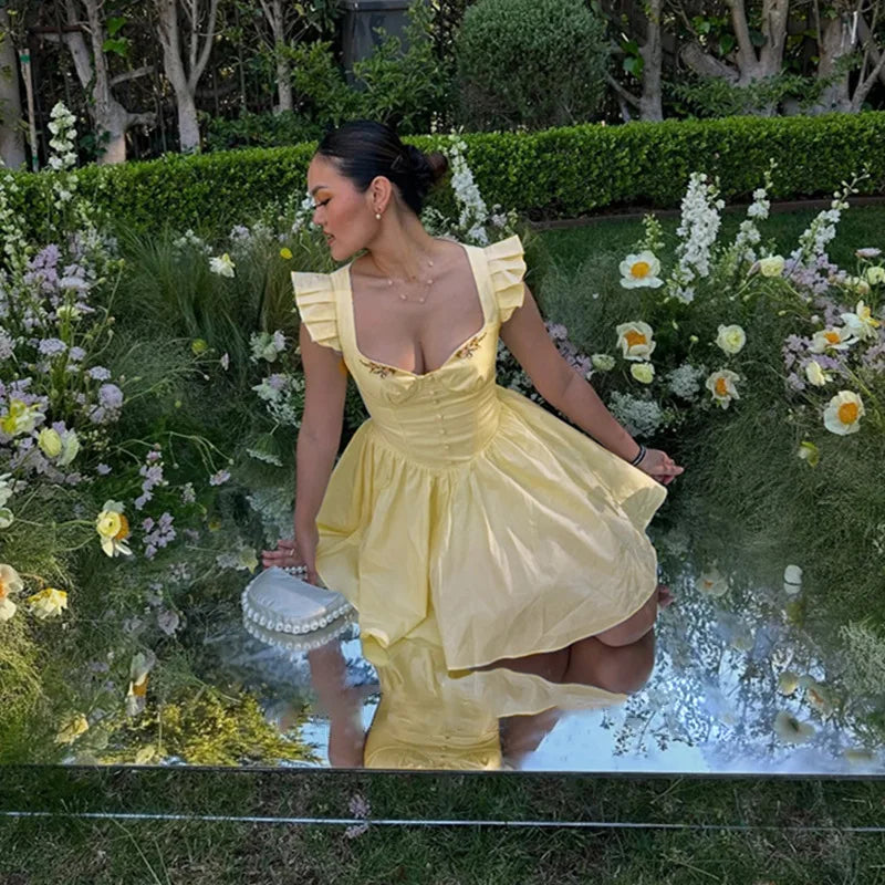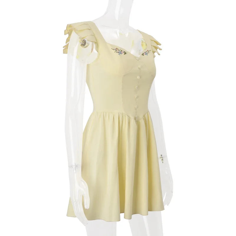 Yellow Floral Embroidery Flare Sleeve Mini Dress